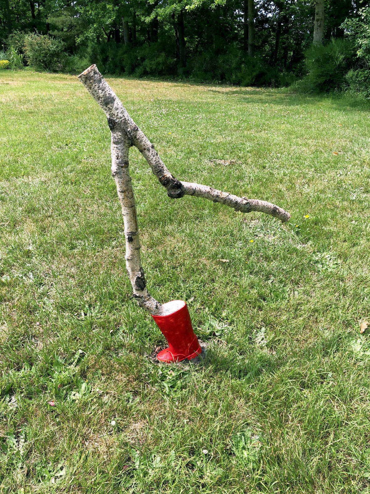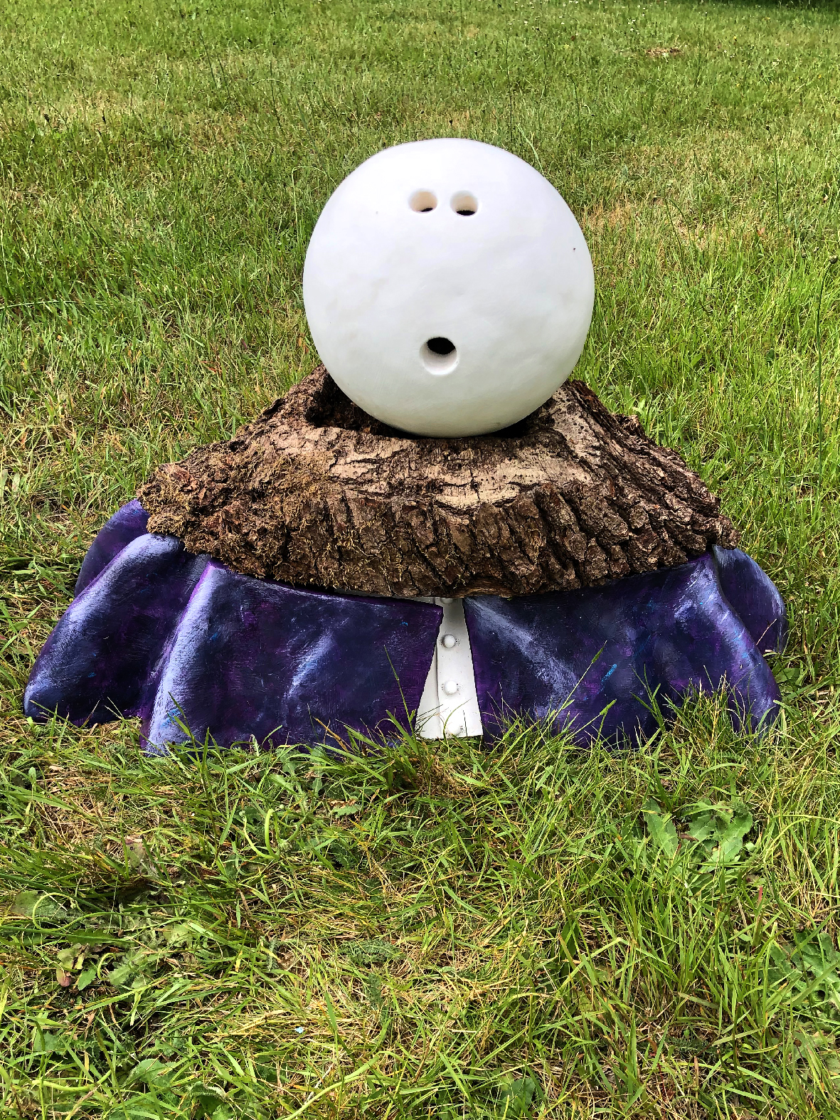 Bois brut, grès, peinture. Dim.: 75 x 40 x 45 cm