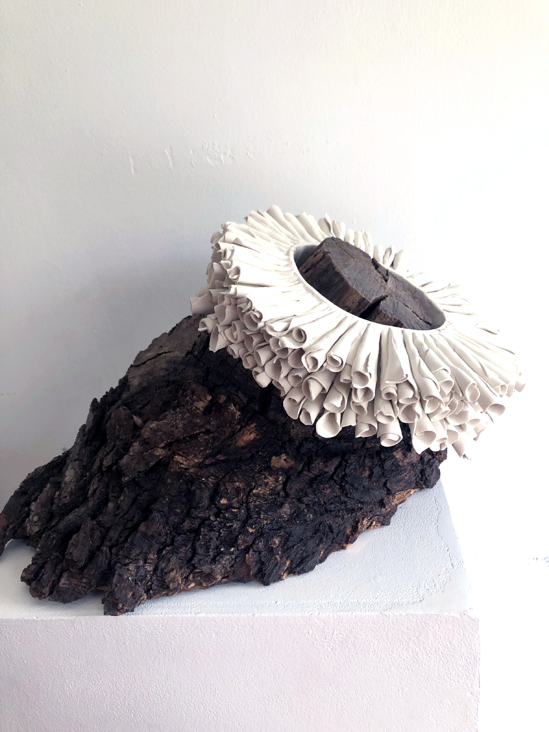 Bois brut, porcelaine Dim.: 42 x 36 x 35 cm