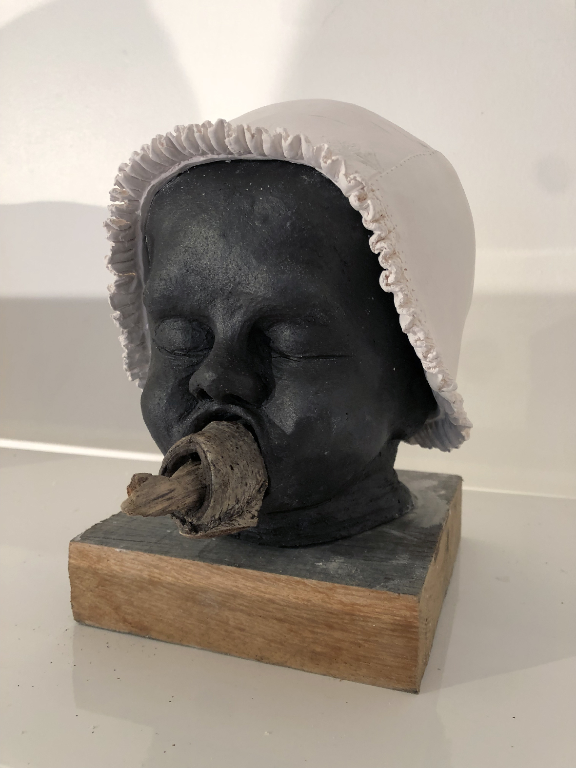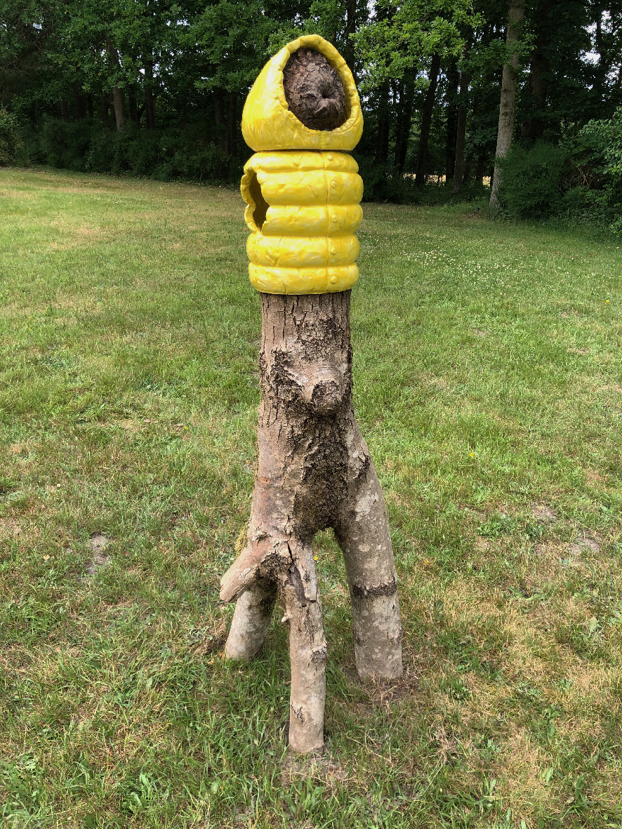 Bois brut, grès, émail. Dim.: 22 x 28 cm